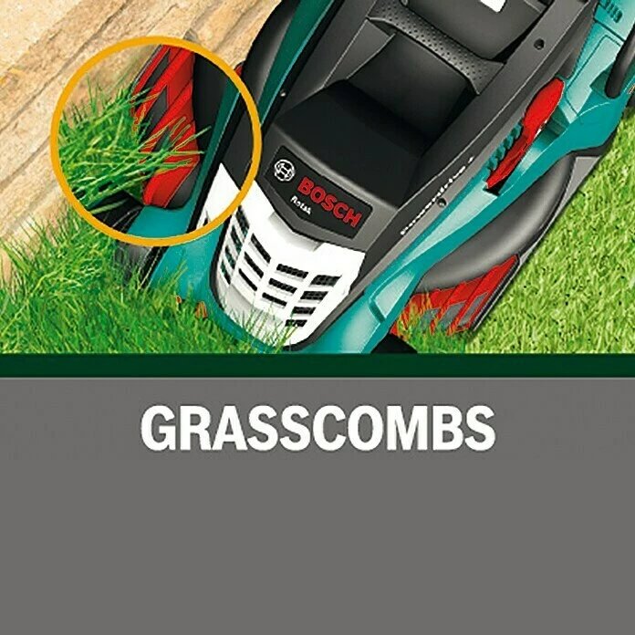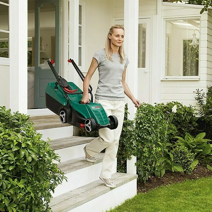 Der Bosch ARM 32 Elektro-Rasenmäher ist hervorragend zur Pflege von kleinen Rasenflächen bis zu 150 m² geeignet. Das kompakte Gerät verfügt über eine achsweise Höhenverstellung, sodass sich die Schnitthöhe in 3 Stufen von 20 mm bis 60 mm anpassen lässt. Dank der patentierten, seitlich angebrachten Rasenkämme ist randnahes Mähen möglich, außerdem wird das Gras durch die Kämme aufgestellt und ein besseres Schnittergebnis erreicht. Das Gehäuse des Mähers ist aus robustem Kunststoff gefertigt, sodass ein geringes Gewicht erreicht und ein leichter Transport ermöglicht werden. Im Fangkorb mit einem Volumen von 31 l wird das Schnittgut schon während des Mähvorgangs aufgenommen, sodass kein Nacharbeiten der Rasenfläche nötig ist. Der Führungsholm kann werkzeuglos mittig zusammengeklappt werden, sodass sich der Rasenmäher platzsparend verstauen lässt.
