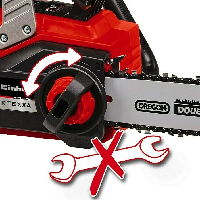 Die Einhell Akku-Kettensäge FORTEXXA 18/30 ist ein leistungsstarkes Mitglied der flexiblen Power X-Change-Familie. Als der perfekte Helfer bei Holzarbeiten an dick verzweigten Obstbäumen und dichten Laub- und Nadelgehölzern wird die FORTEXXA von einem Einhell Brushless-Motor angetrieben, einem bürstenlosen Elektromotor, der langlebiger und leistungsstärker als ein herkömmlicher Kohlebürsten-Motor ist. Mitsamt OREGON Qualitätsschwert und -Kette haben auch dicke Zweige und Äste der FORTEXXA kaum etwas entgegen zu setzen. Auch bei Arbeiten rundum Werk- und Kanthölzer sowie Brennholz leistet die Akku-Version einer Kettensäge beste Ergebnisse. Eine werkzeuglos einstellbare Kettenspannung und einen ebenso einfachen Kettenwechsel erleichtern die Handhabung. Der Kettenfänger und der Rückschlagschutz mit Sofort-Kettenbremse sorgen für die Sicherheit bei der Anwendung und die automatische Kettenschmierung über die große Öleinfüllöffnung für die einfache Pflege. Der robuste Krallenanschlag besteht aus Metall, der ergonomische Griff ist mit Softgrip für einen festen und sicheren Halt ausgerüstet. Zum Betrieb ist 1x 18 Volt-Akku der flexiblen Power X-Change-Reihe notwendig. Die innovative Power X-Change-Reihe von Einhell punktet mit starker Leistung und maximaler Flexibilität: Die Lithium-Ionen-Akkus sind unter den Geräten der Systemreihe von Einhell unbegrenzt austauschbar. Jeder System-Akku kann bei jedem Power X-Change-Gerät verwendet werden. Die Kettengeschwindigkeit ist anpassbar je nach Anwendung, d.h. es kann zwischen voller Leistung (8 m/s) und Eco-Modus (6 m/s) umgeschaltet werden. Mit der reduzierten Kettengeschwindigkeit wird die Akku Laufzeit verlängert. Die Lieferung erfolgt ohne Akku und ohne Ladegerät, diese sind separat erhältlich, zum Beispiel als praktisches Starter-Set in verschiedenen Stärken.