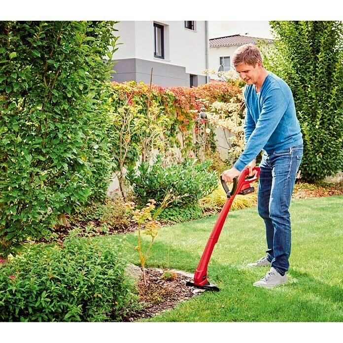Mit dem Einhell Akku Rasentrimmer GC-CT 18/24 Li P-Solo können grüne Ränder, Grasstreifen und unwegsamen Ecken leicht beseitig werden – kabellos und ohne Bewegungseinschränkungen. Der Akku Rasenschneider ist ein Mitglied der Power X-Change-Familie: die kraftvollen Systemakkus finden bei allen Geräten der Reihe Anwendung. Für den Betrieb ist eine 18 V-Batterie notwendig. Durch den Zusatzhandgriff kann der Akku Rasentrimmer mit Kunststoffmesser bequem mit zwei Händen bedient werden. Bei der Ausführung von Gehäuse und Zusatzgriff wurde auf Langlebigkeit Wert gelegt, sie sind aus schlagzähem, hochwertigem Kunststoff gefertigt. Mit bis zu 8.500 Umdrehungen pro Minute arbeitet der Akku Kantenschneider kraftvoll auf einer Schnittbreite von bis zu 24 Zentimetern. Zum Lieferumfang gehören 20 Stück Kunststoffmesser. System-Akku und Ladegerät sind separat erhältlich.