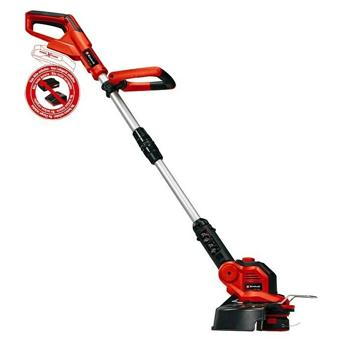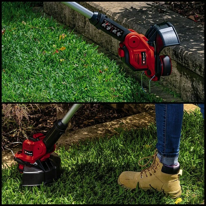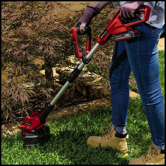 Der Einhell Akku-Rasentrimmer GE-CT 18/28 Li-Solo stemmt die Herausforderungen im heimischen Garten rund um Ränder an Rasenflächen, engen Stellen oder Kanten. Durch das geringe Gewicht und die leichte Handhabung des leistungsstarken Power X-Change-Trimmers lassen sich derartige Problemstellen mühelos bearbeiten. Die Akkus mit den hochwertigen Lithium-Ionen-Akkuzellen können mit allen Mitgliedern der Power X-Change-Familie kombiniert werden. Der Akku-Rasentrimmer ist bequem in der Handhabung durch den stufenlos verstellbaren zweiten Handgriff und den Softgrip für den perfekten Komfort. Mittels des stufenlos teleskopierbaren Führungsholms lässt sich die Höhe individuell an die Nutzergröße anpassen. Der 3-fach neigbare Motorkopf ist um 180° drehbar, so dass auch senkrechte Flächen und Rasenkanten flexibel und bequem bearbeitet werden können. Während des Einsatzes schützt der Flowerguard Pflanzen und Bäume vor Beschädigungen. Im Lieferumfang enthalten ist eine Fadenspule (5m) mit vollautomatischer Fadennachführung. Die Lieferung erfolgt ohne Akku und ohne Ladegerät. Diese sind, zum Beispiel als praktisches Power X-Change Starter-Set, separat erhältlich. Für den Betrieb des Akku-Rasentrimmers ist 1x 18 Volt PXC-Akku nötig.