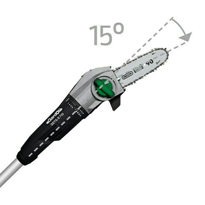 Der Gardol Elektro-Hochentaster GETS-E 710 KIT ist optimal für das Entasten und Auslichten von schwer erreichbaren Gehölzen in Baumkronen und am Boden geeignet. Der längenverstellbare Teleskopstil mit Alu-Spilt-Shaft ermöglicht ein Arbeiten in bis zu 3,2 m Höhe. Der Motorkopf ist um 15° geneigt. Die hochwertige Kette und Schwert sorgen für ein sauberes Schnittergebnis. Dank werkzeuglosem Kettenspannen, Ölstandsanzeige und automatischer Kettenschmierung ist die Wartung denkbar einfach. Der verstellbare Hüfttragegürtel mit Adpater sorgt für einen hohen Komfort.