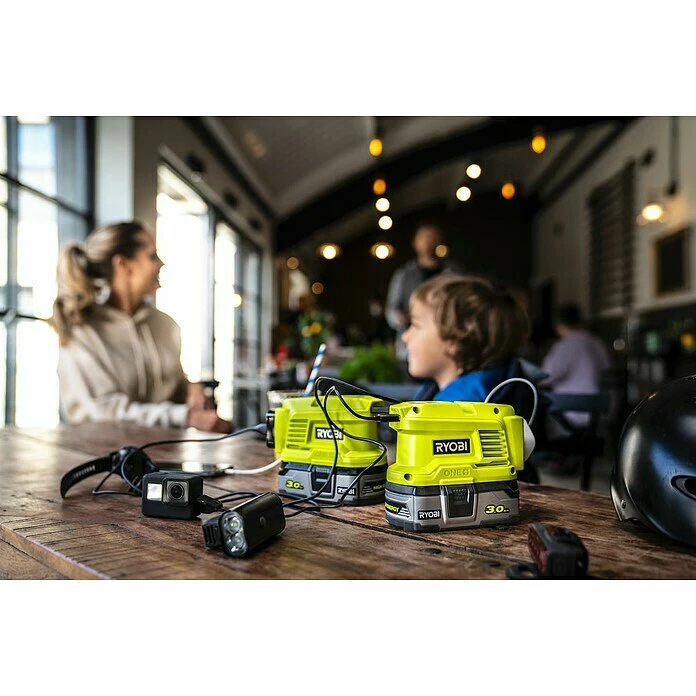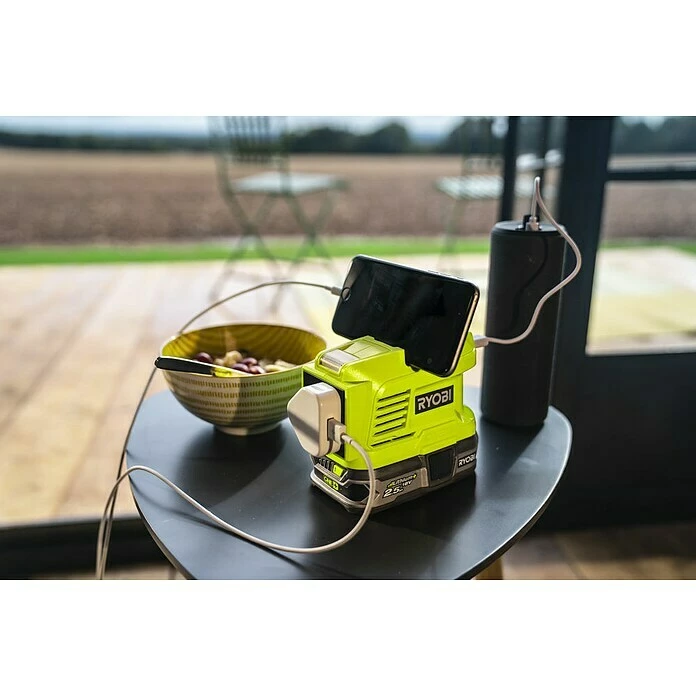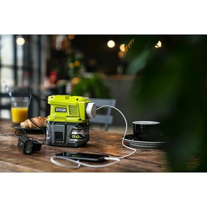18 V ONE+ Akku-Wechselrichter, Kontinuierliche Wattage 150 W, ohne Akku und Ladegerät. Der leistungsstarke Wechselrichter bietet eine kontinuierliche Wechselstromversorgung von 230 V / 150 W, mit der Sie kabelgebundene Produkte auch außerhalb von zu Hause aus mit Strom versorgen können. Ideal um kleinere Geräte wie Laptops, Leuchten, Ventilatoren oder Kameras mit Strom zu versorgen. 2x USB Anschlüsse, um Smartphone, Tablets oder andere USB-Geräte zu laden. 1 x EU-Stecker Anschluss für Ventilatoren, Rasierer, Zahnbürsten und vieles mehr. LED-Beleuchtung stellt sicher, dass Geräte und Kabel in allen Umgebungen problemlos angeschlossen werden können. LED-Beleuchtung mit 2 Helligkeitsstufen: 50 % und 100 %. Integrierte Smartphone-Halterung für TV, Filme und Spiele. Klein, kompakt und leicht. Ideal geeignet für Camping, Autoreisen, etc.